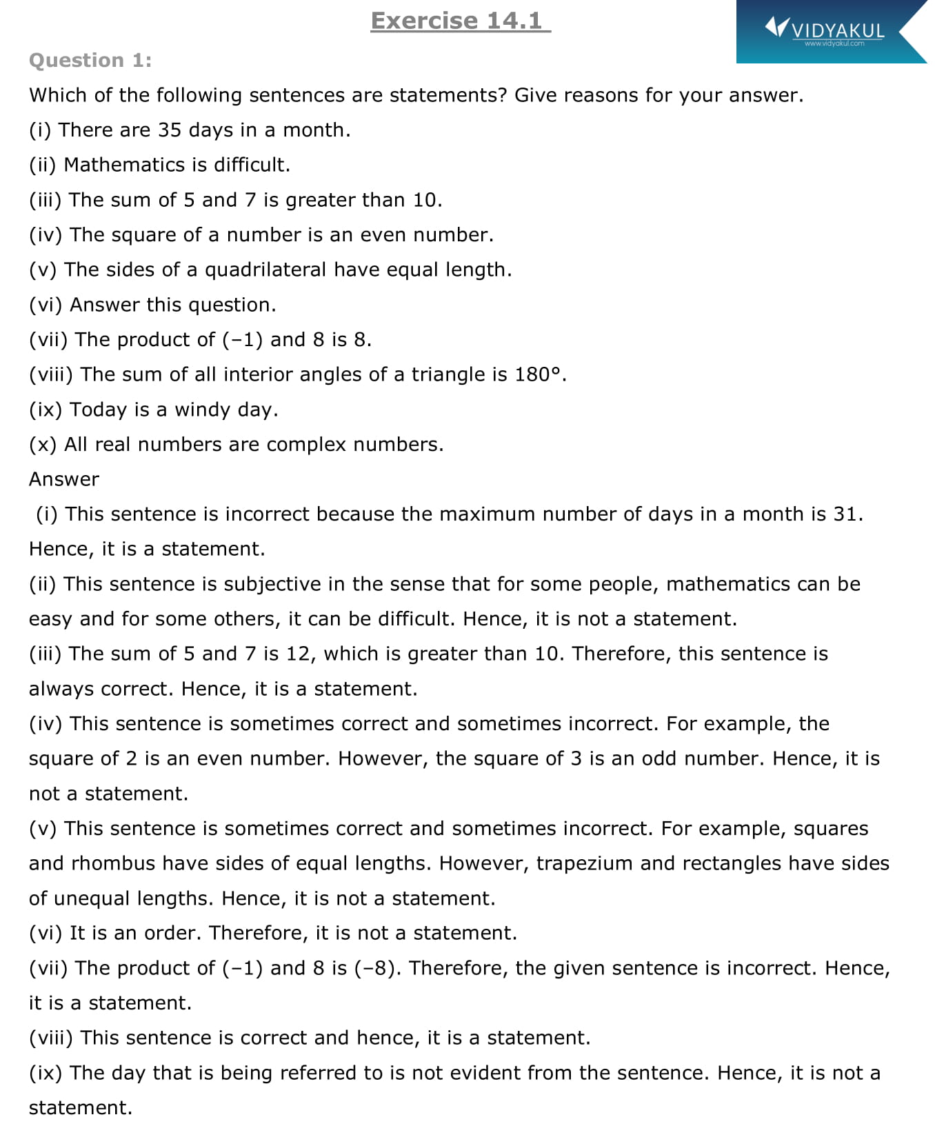 It is vital to solve all the NCERT exercises for scoring well in CBSE exam, therefore Vidyakul brings Class 11 NCERT Solutions Mathematics Chapter 14 Mathematical Reasoning to enable students.