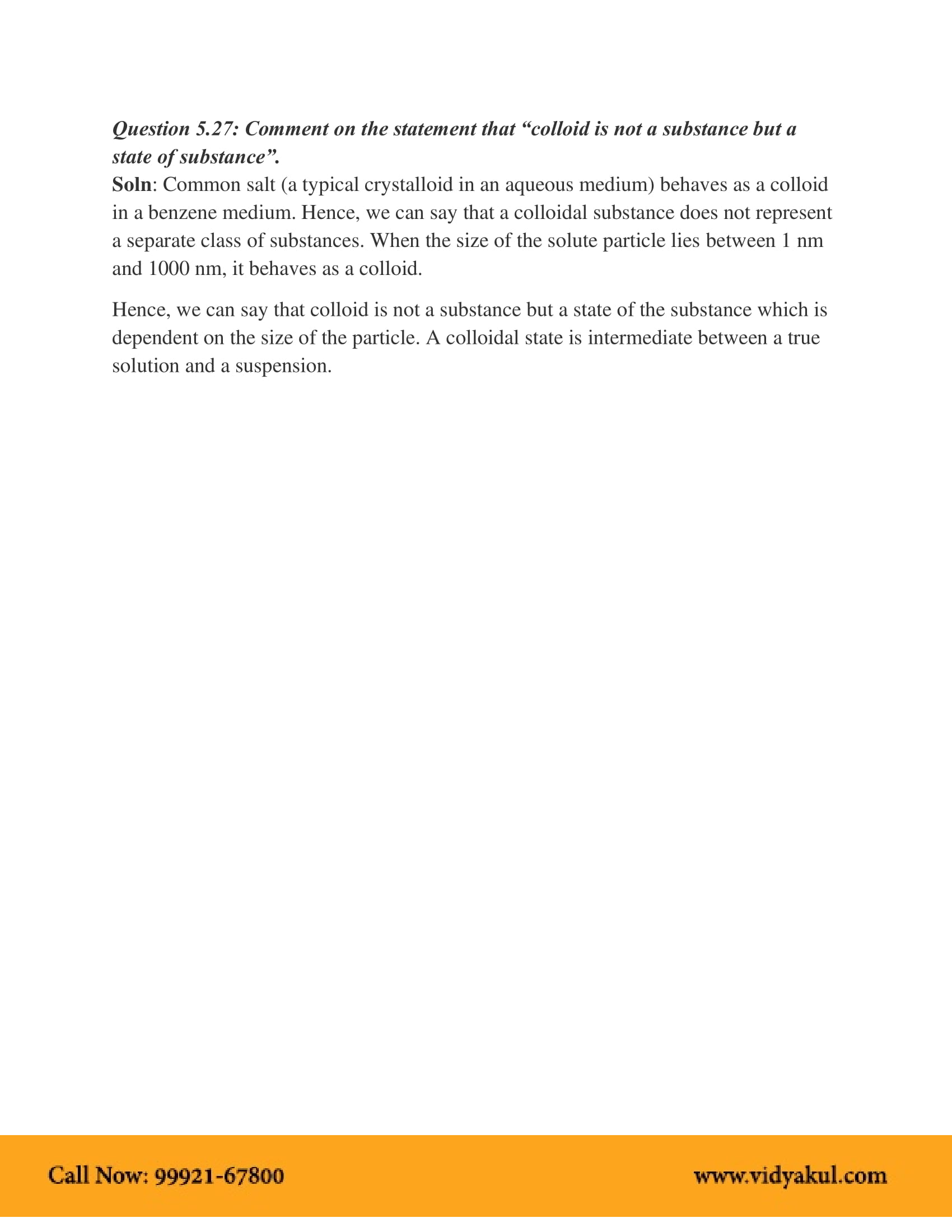 Vidyakul brings to you PDF, downloadable version of NCERT Solution Class 12 Chemistry Chapter 5 Surface Chemistry solved by our panel of experienced teachers as per NCERT (CBSE) book guidelines. AllSurface Chemistry exercise questions, notes with solutions will help you to revise complete syllabus with ease and score maximum marks. Cover all important questions and solution of Chapter – 5 Surface Chemistry. Register now and get access to our videos for a detailed explanation of the concept and other resources to help you with this chapter in depth.