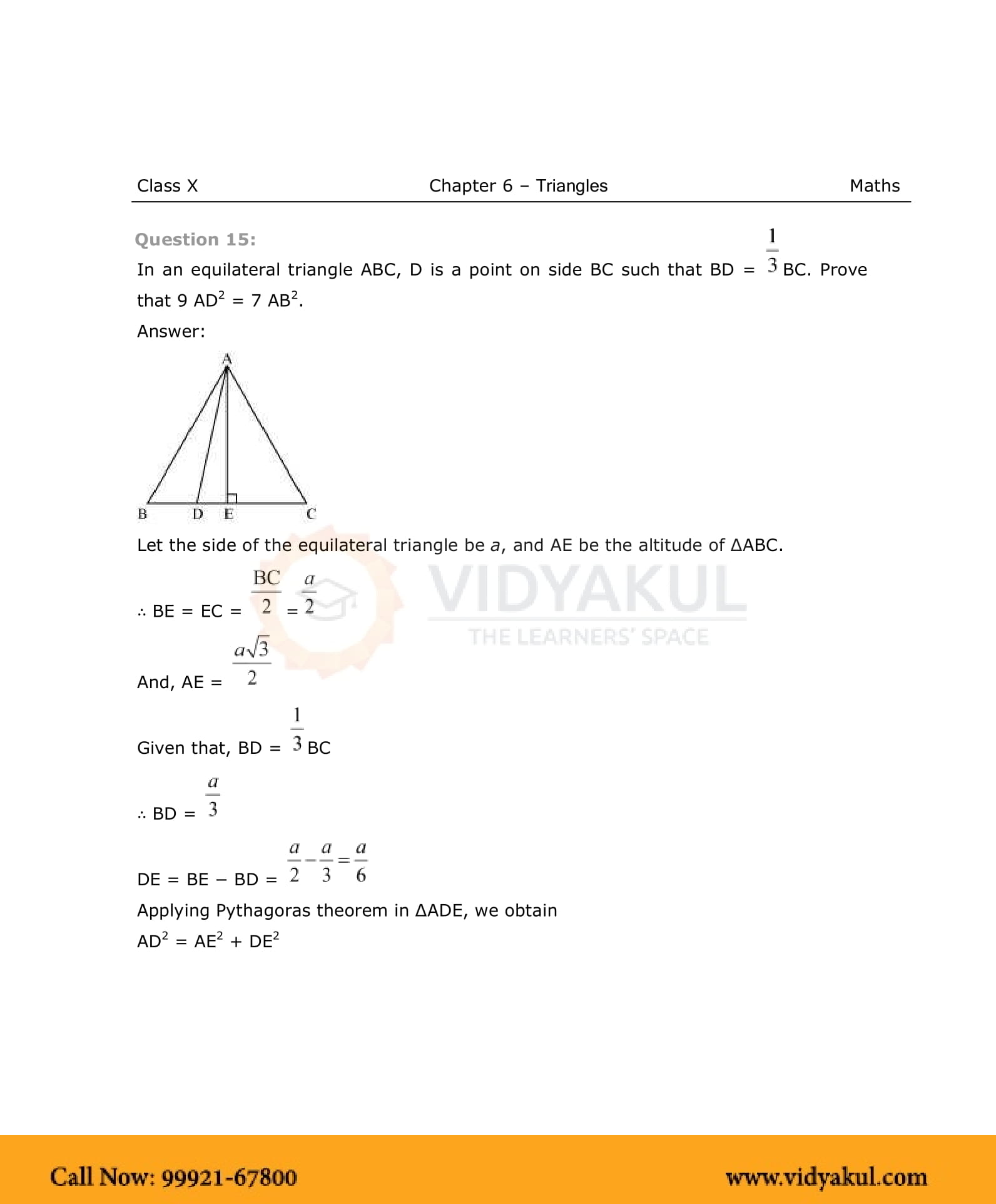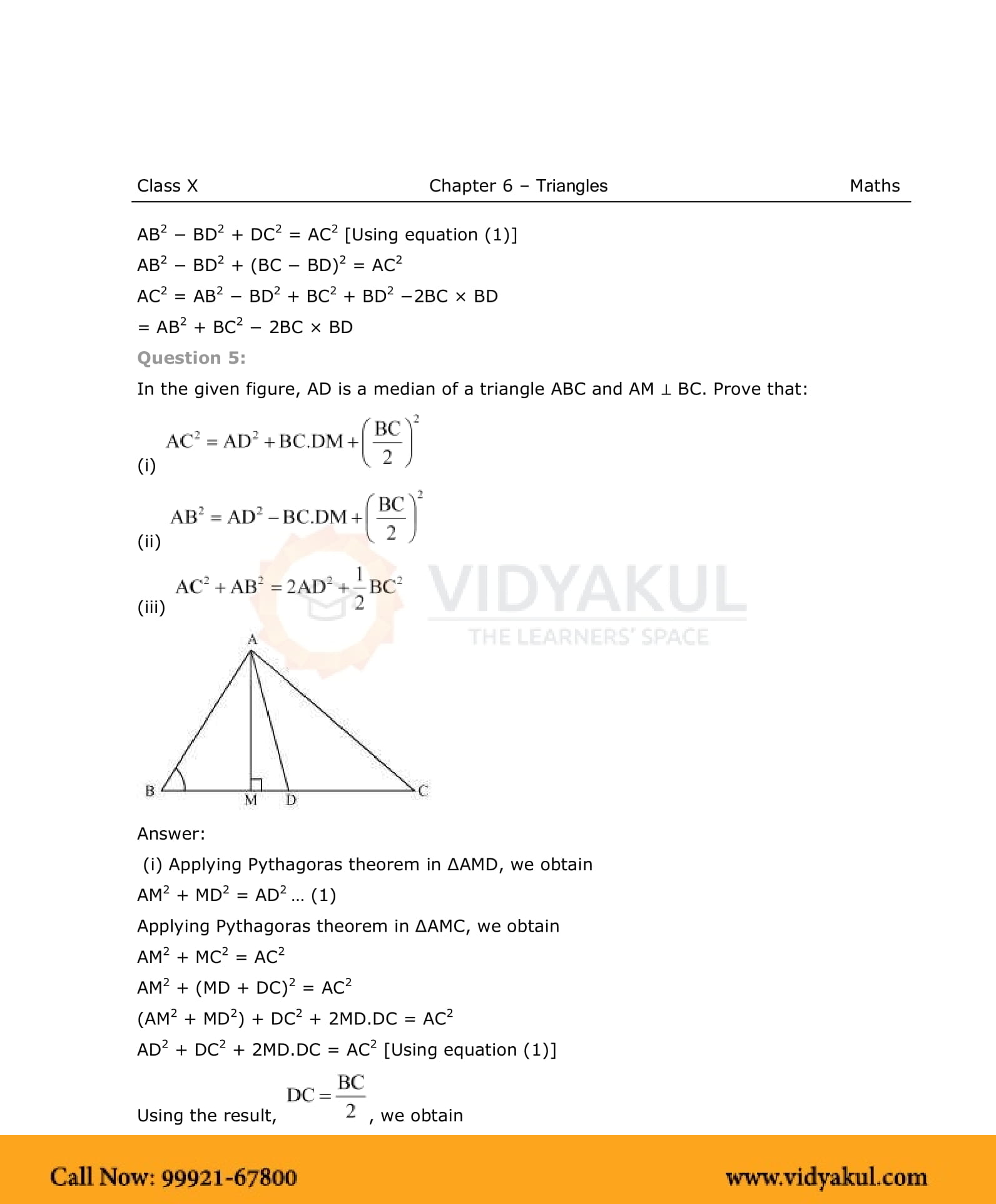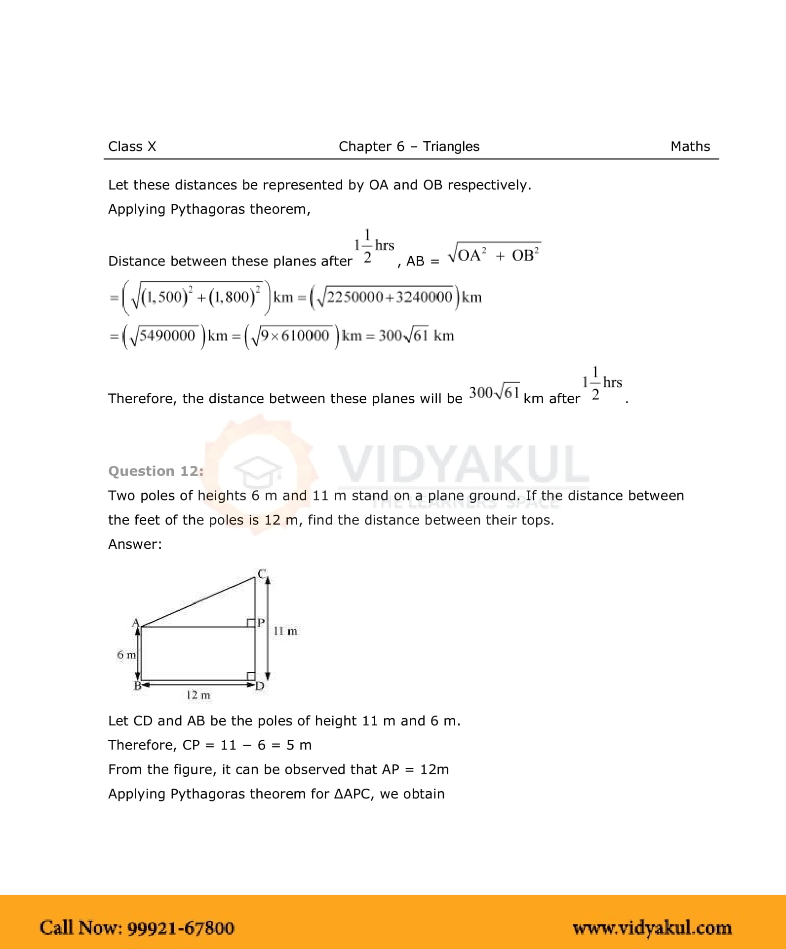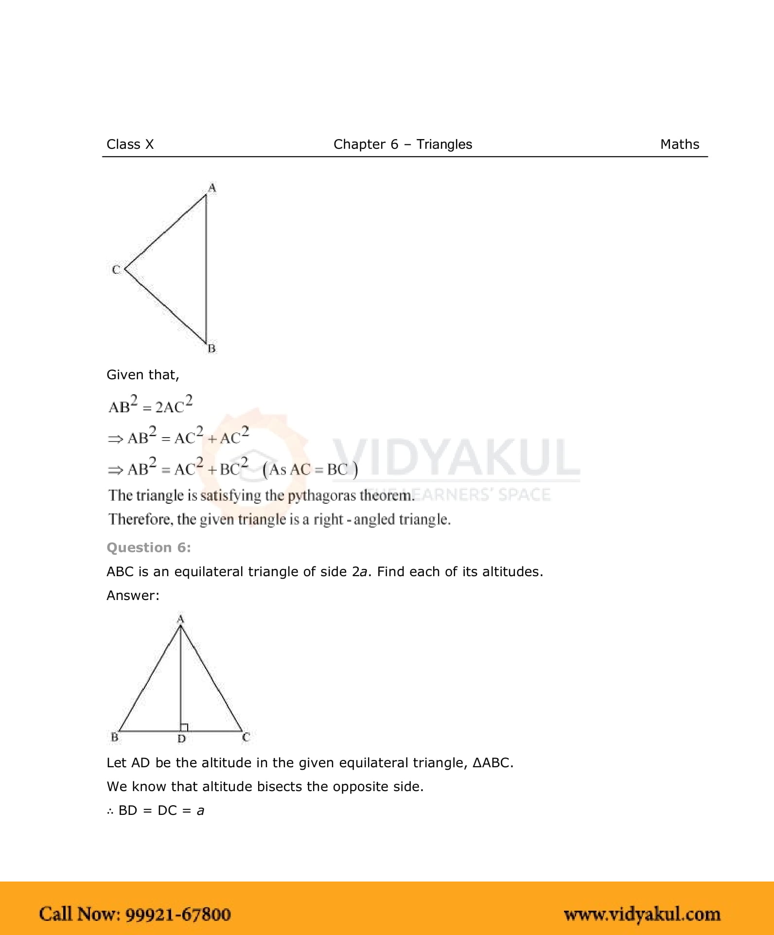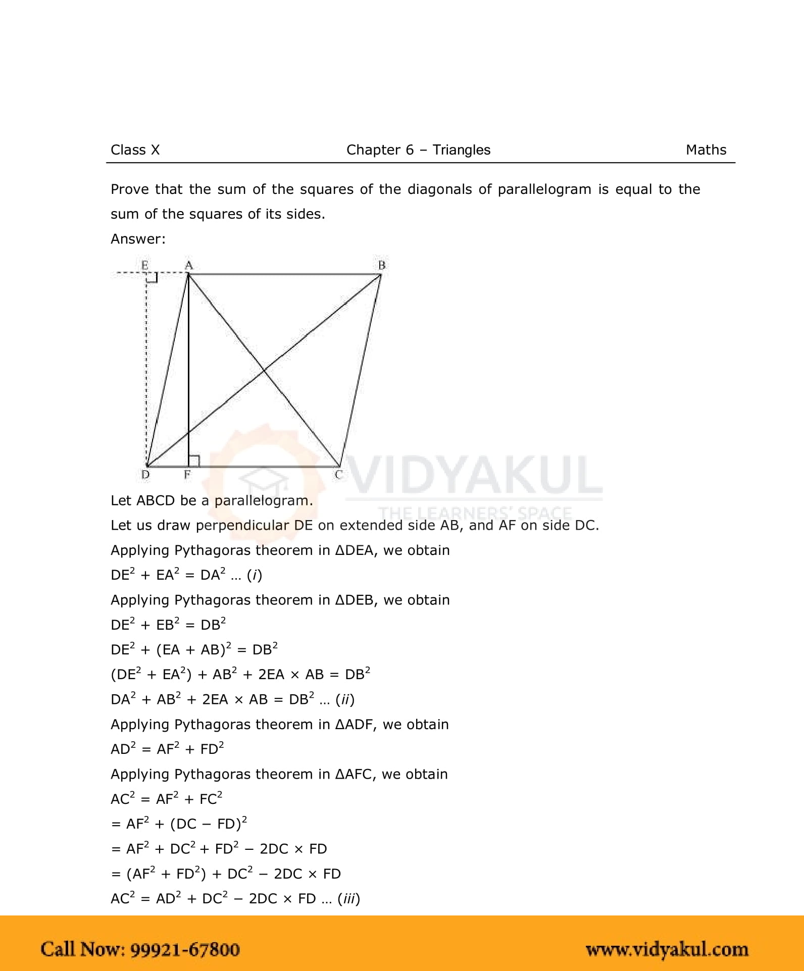 Students can take help from NCERT Solutions for Class 10 Maths Chapter 6 Triangles to study for their board examinations. In this chapter, you will learn that In a right triangle, the square of the hypotenuse is equal to the sum of the squares of the other two sides (Pythagoras Theorem). If in a triangle, square of one side is equal to the sum of the squares of the other two sides, then the angle opposite the first side is a right angle.