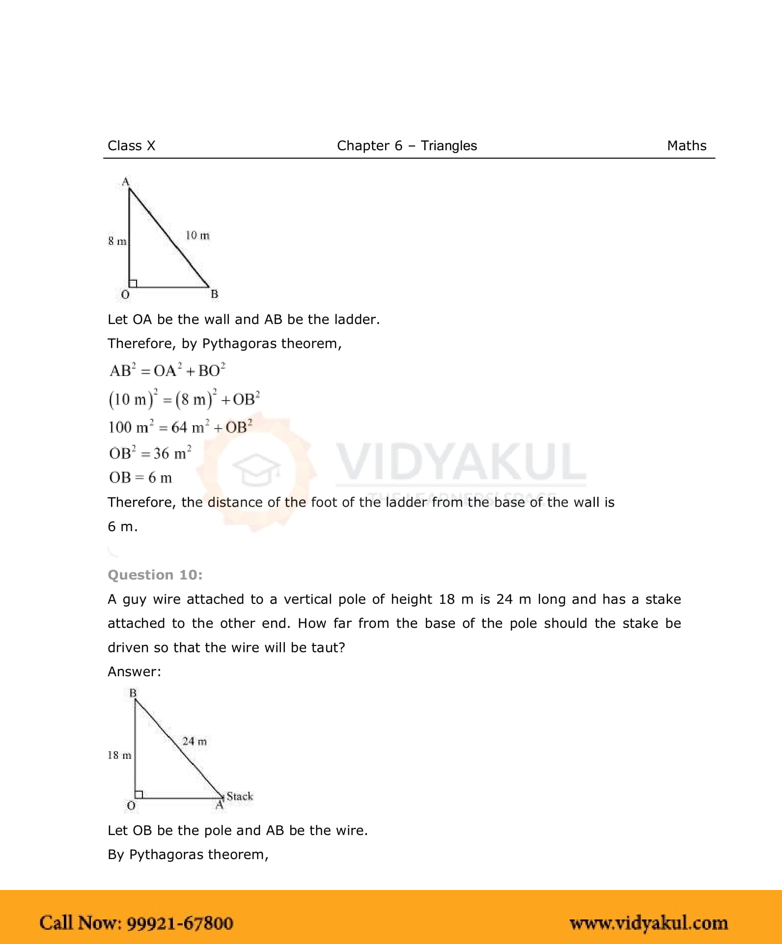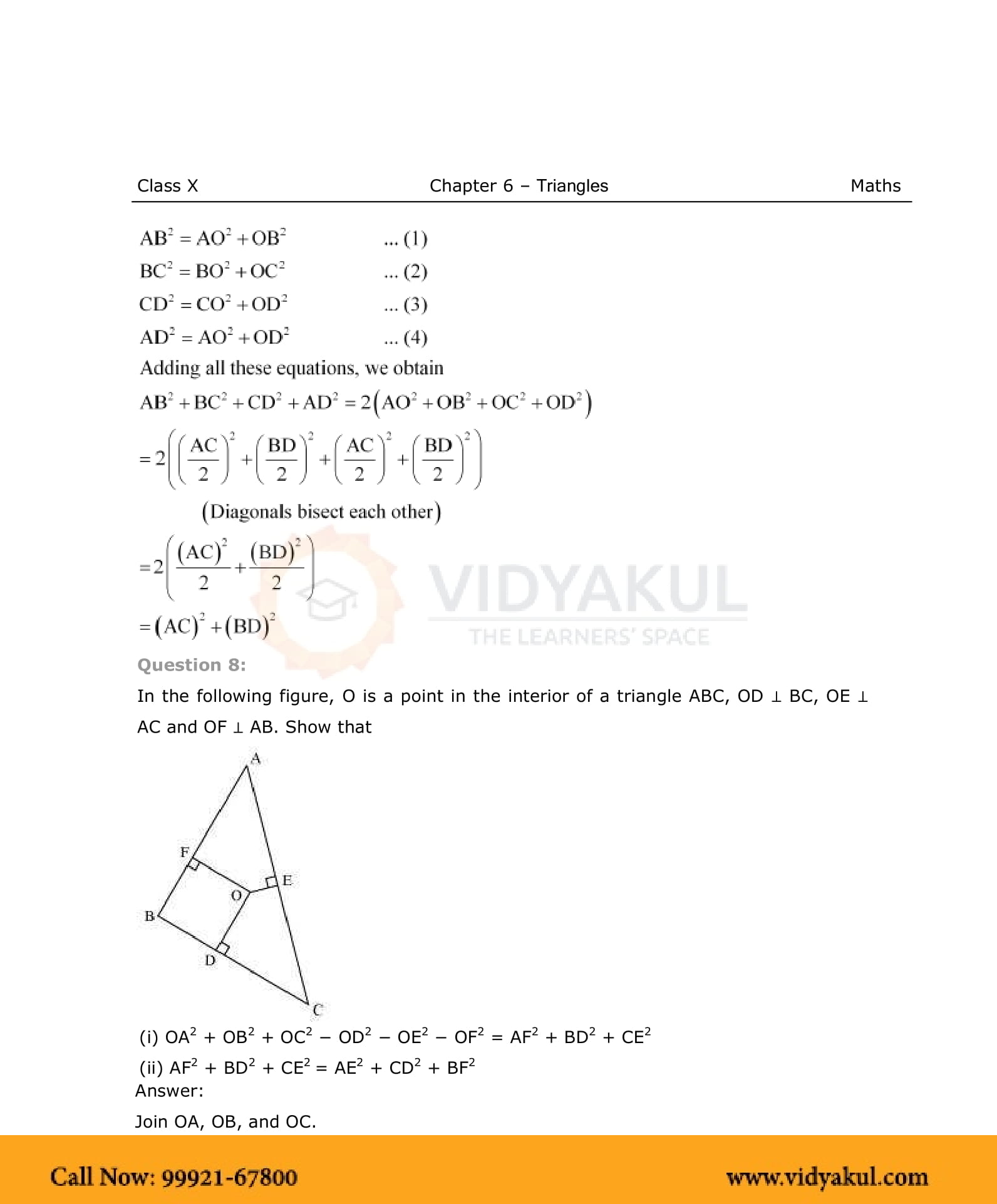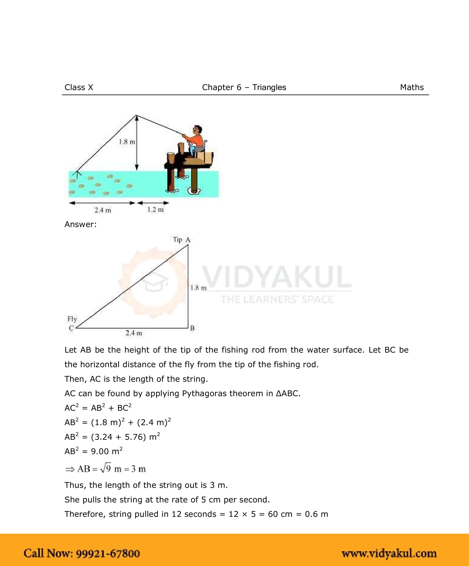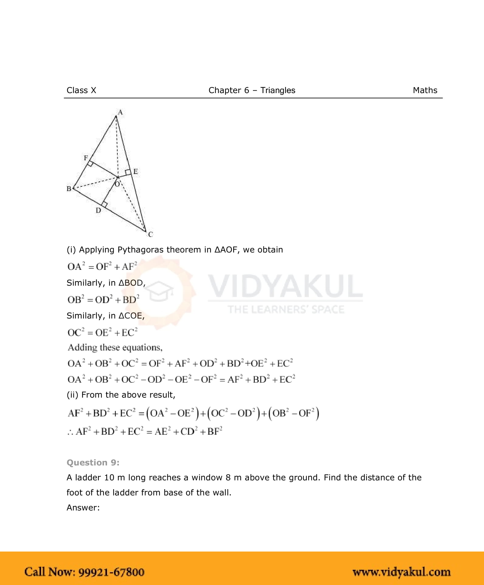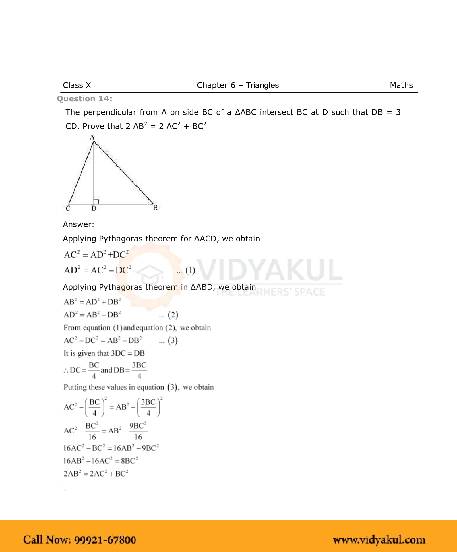 Students can take help from NCERT Solutions for Class 10 Maths Chapter 6 Triangles to study for their board examinations. In this chapter, you will learn that In a right triangle, the square of the hypotenuse is equal to the sum of the squares of the other two sides (Pythagoras Theorem). If in a triangle, square of one side is equal to the sum of the squares of the other two sides, then the angle opposite the first side is a right angle.