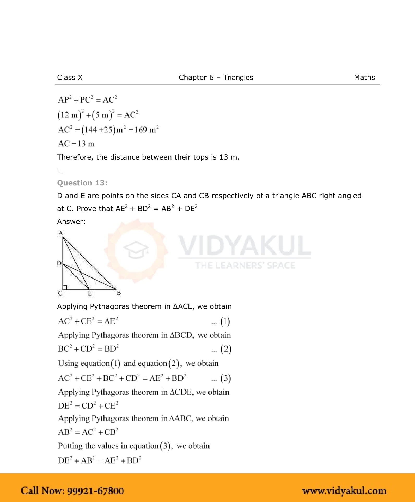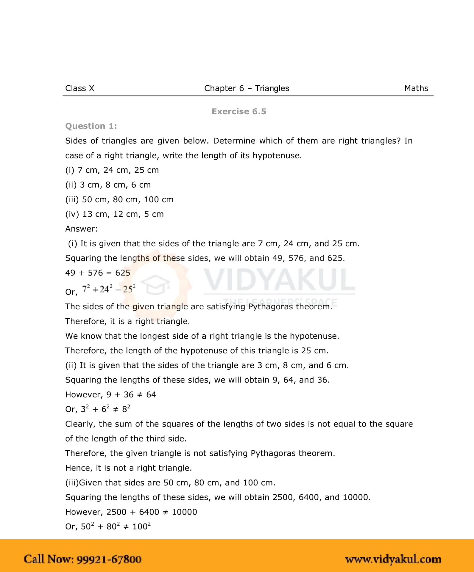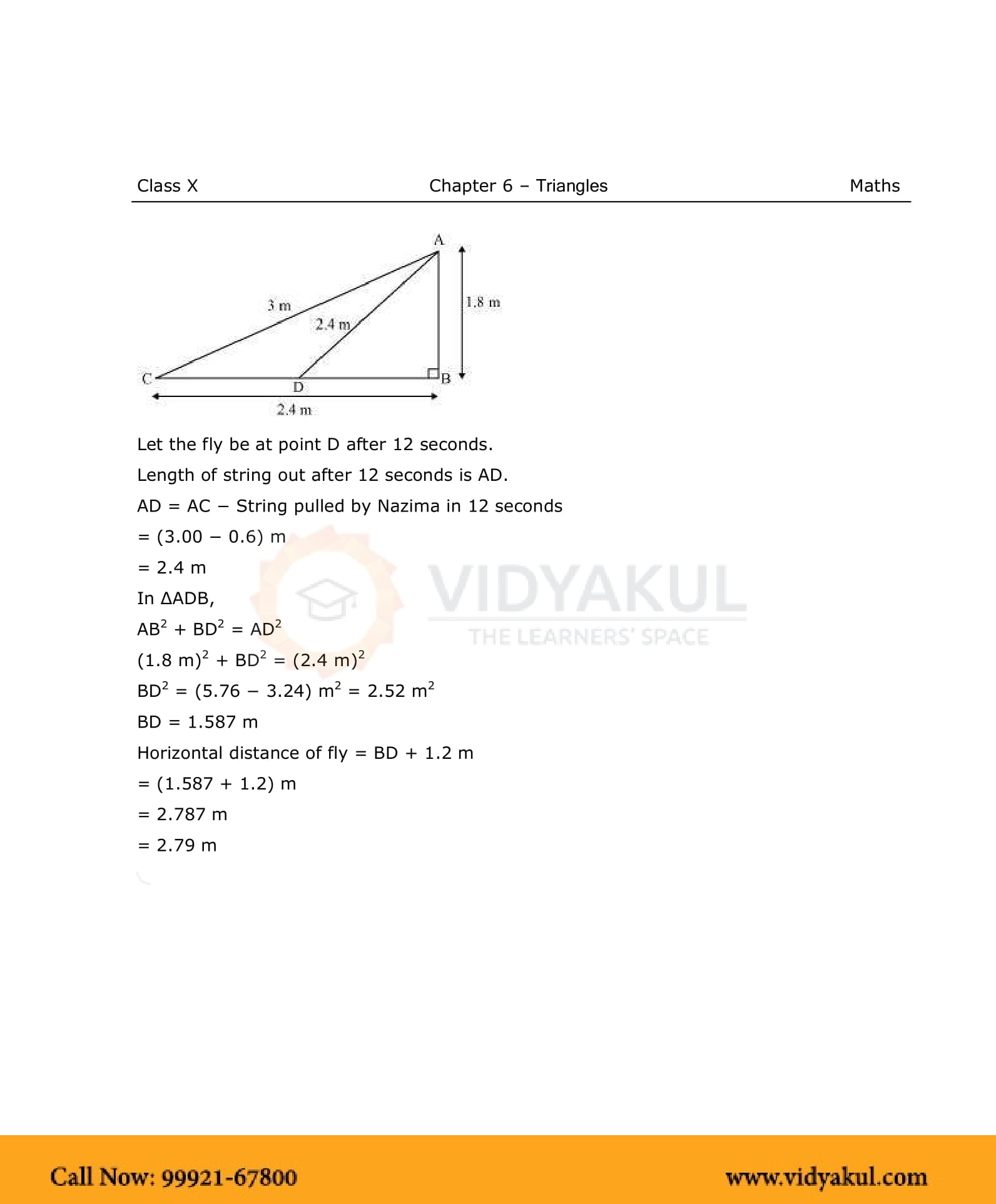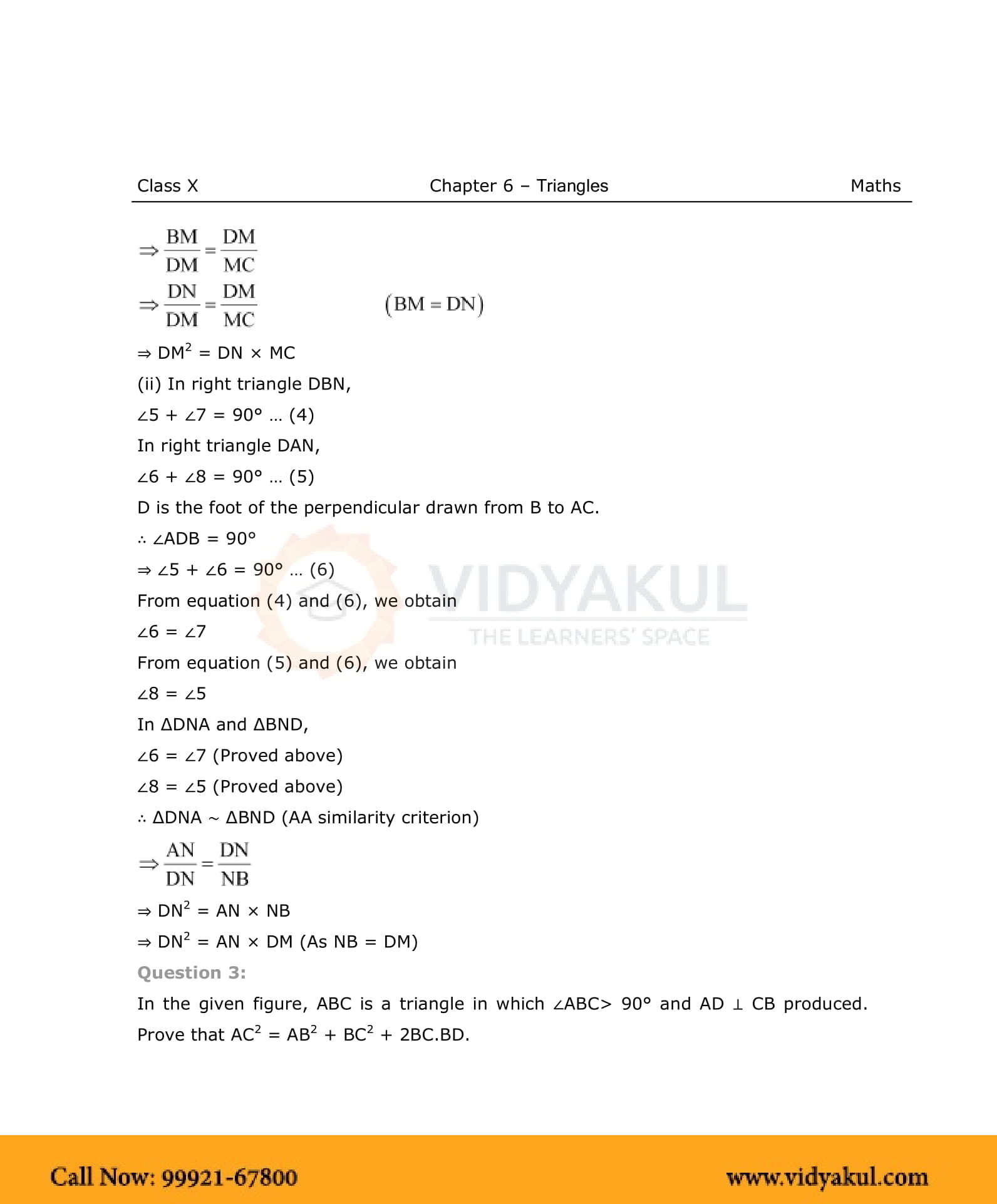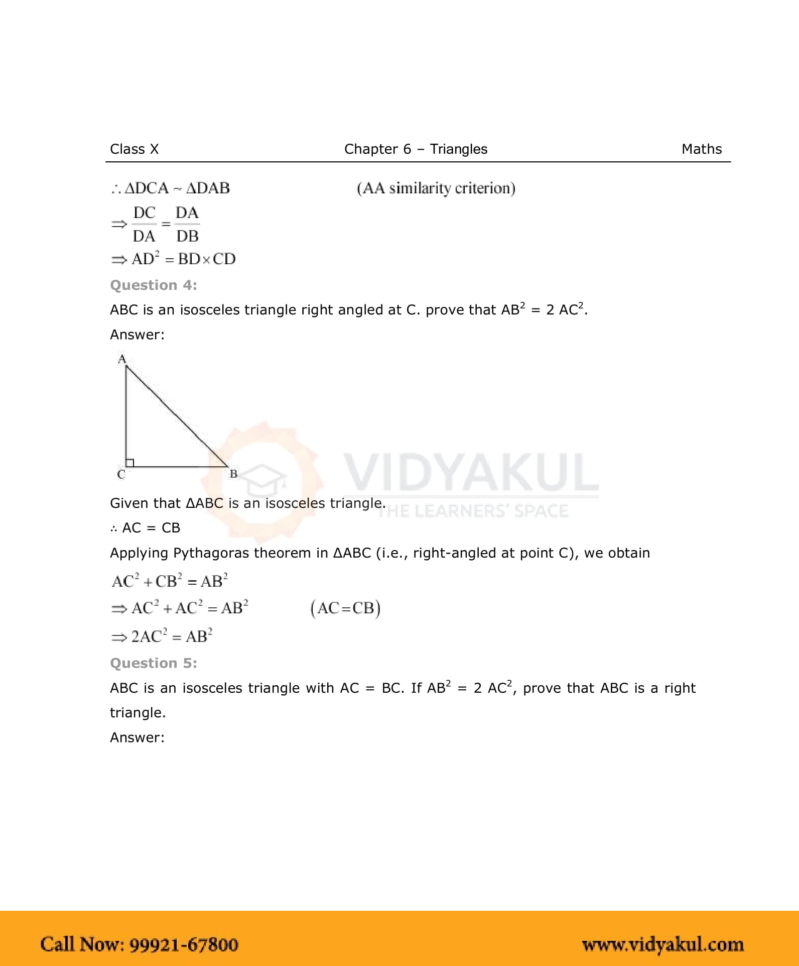 Students can take help from NCERT Solutions for Class 10 Maths Chapter 6 Triangles to study for their board examinations. In this chapter, you will learn that In a right triangle, the square of the hypotenuse is equal to the sum of the squares of the other two sides (Pythagoras Theorem). If in a triangle, square of one side is equal to the sum of the squares of the other two sides, then the angle opposite the first side is a right angle.