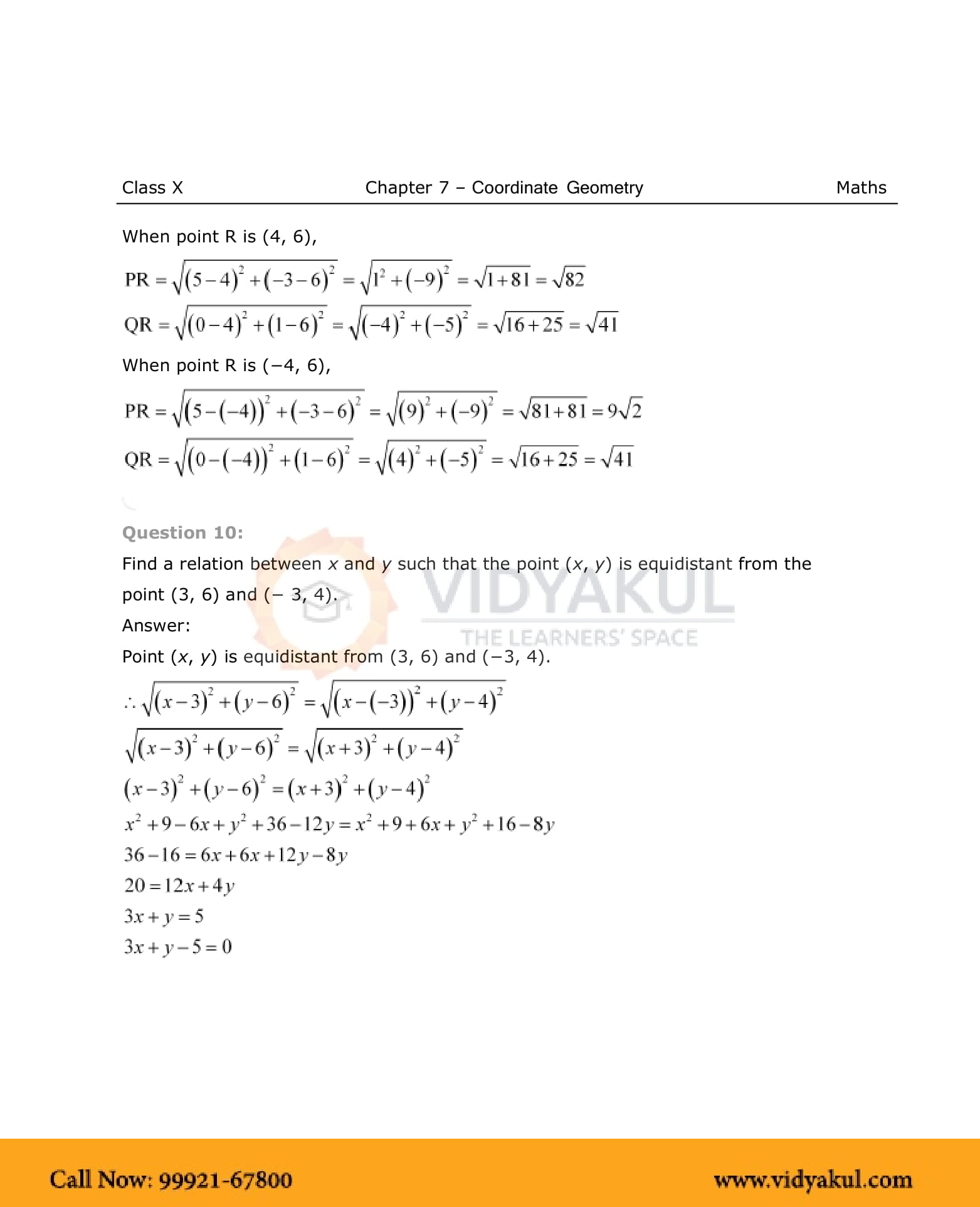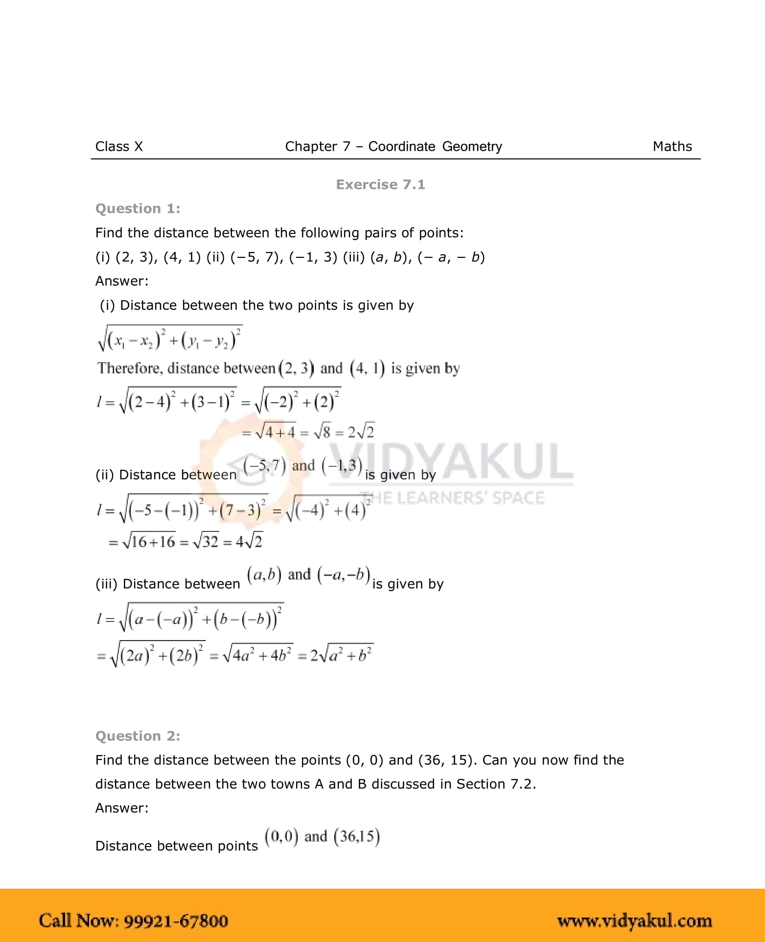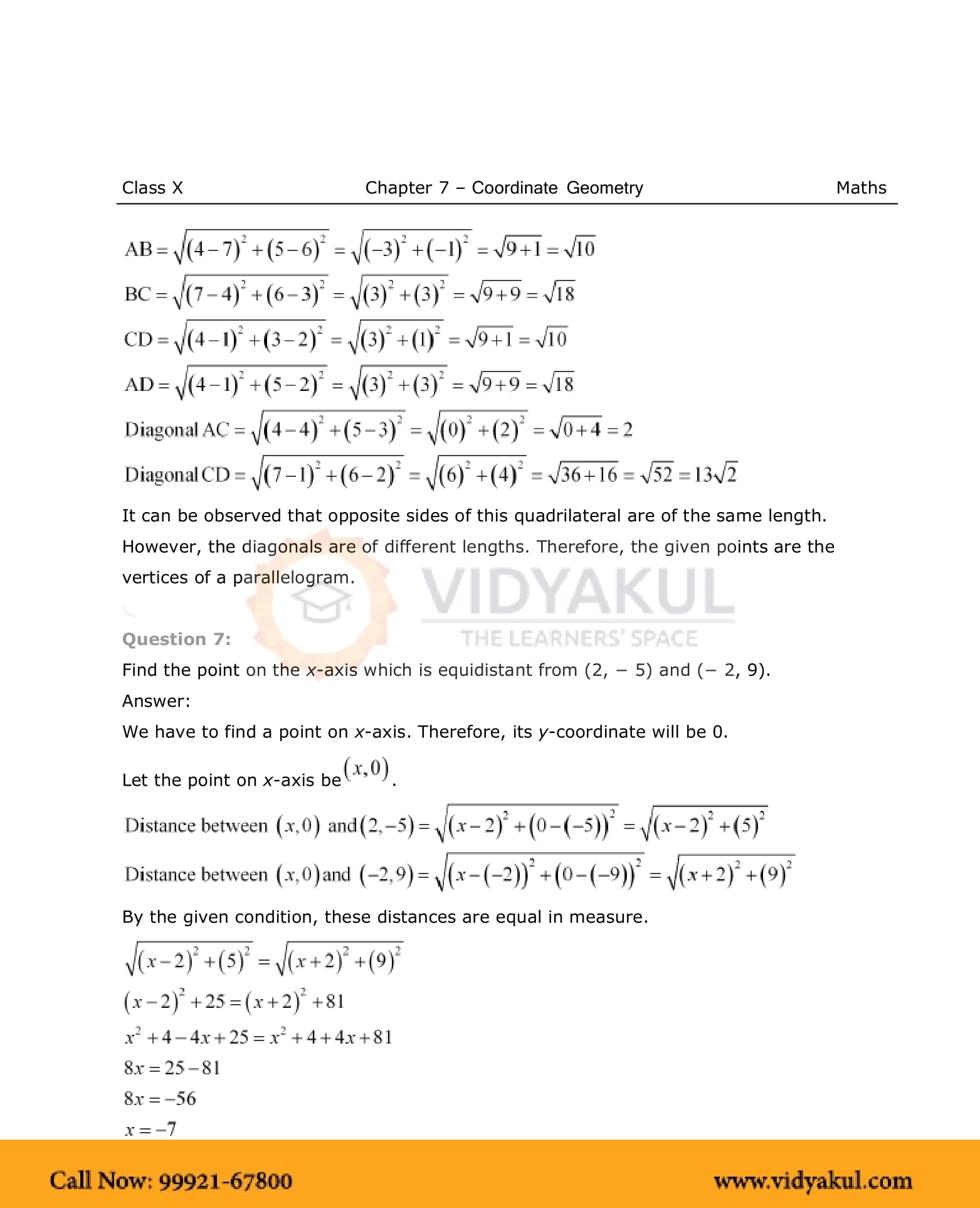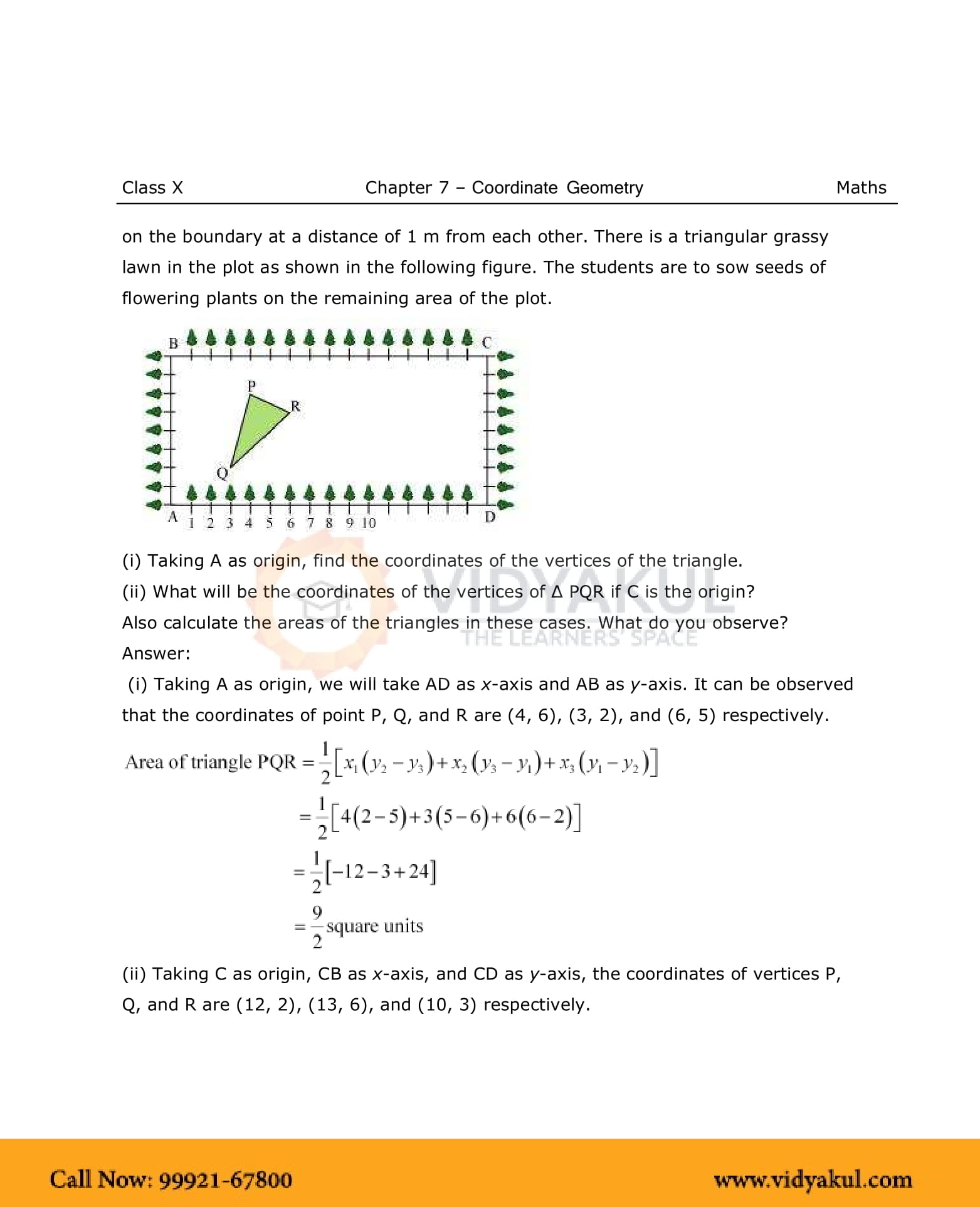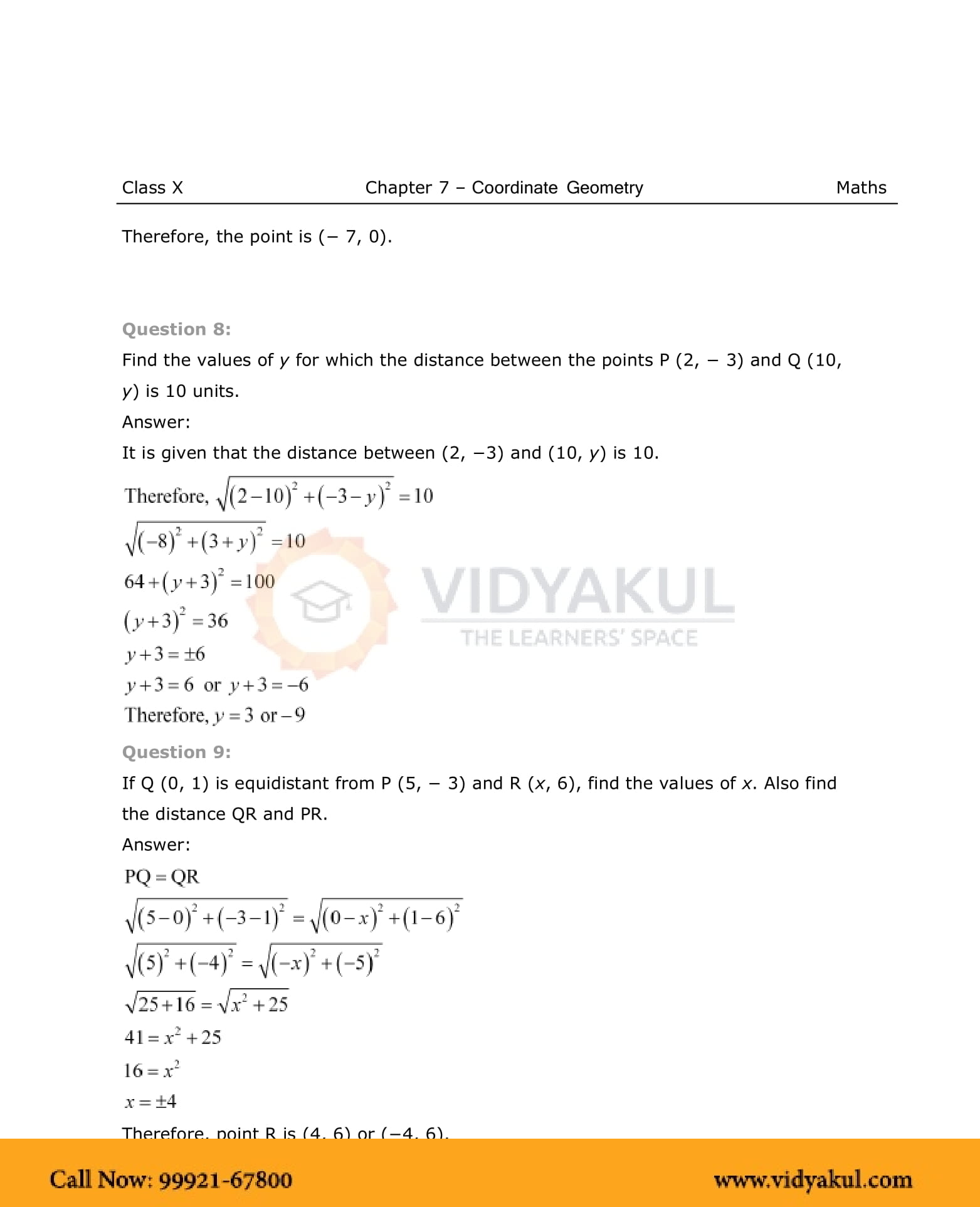 Class 10 students require NCERT Solutions for Class 10 Maths Chapter 7 Coordinate Geometry for better CBSE Board Preparation. In this chapter, you will learn To locate the position of a point on a plane, we require a pair of coordinate axes. The distance of a point from the y-axis is called its x-coordinate, or abscissa. The distance of a point from the x-axis is called its y-coordinate, or ordinate. The coordinates of a point on the x-axis are of the form (x, 0), and of a point on the y-axis are of the form (0, y).