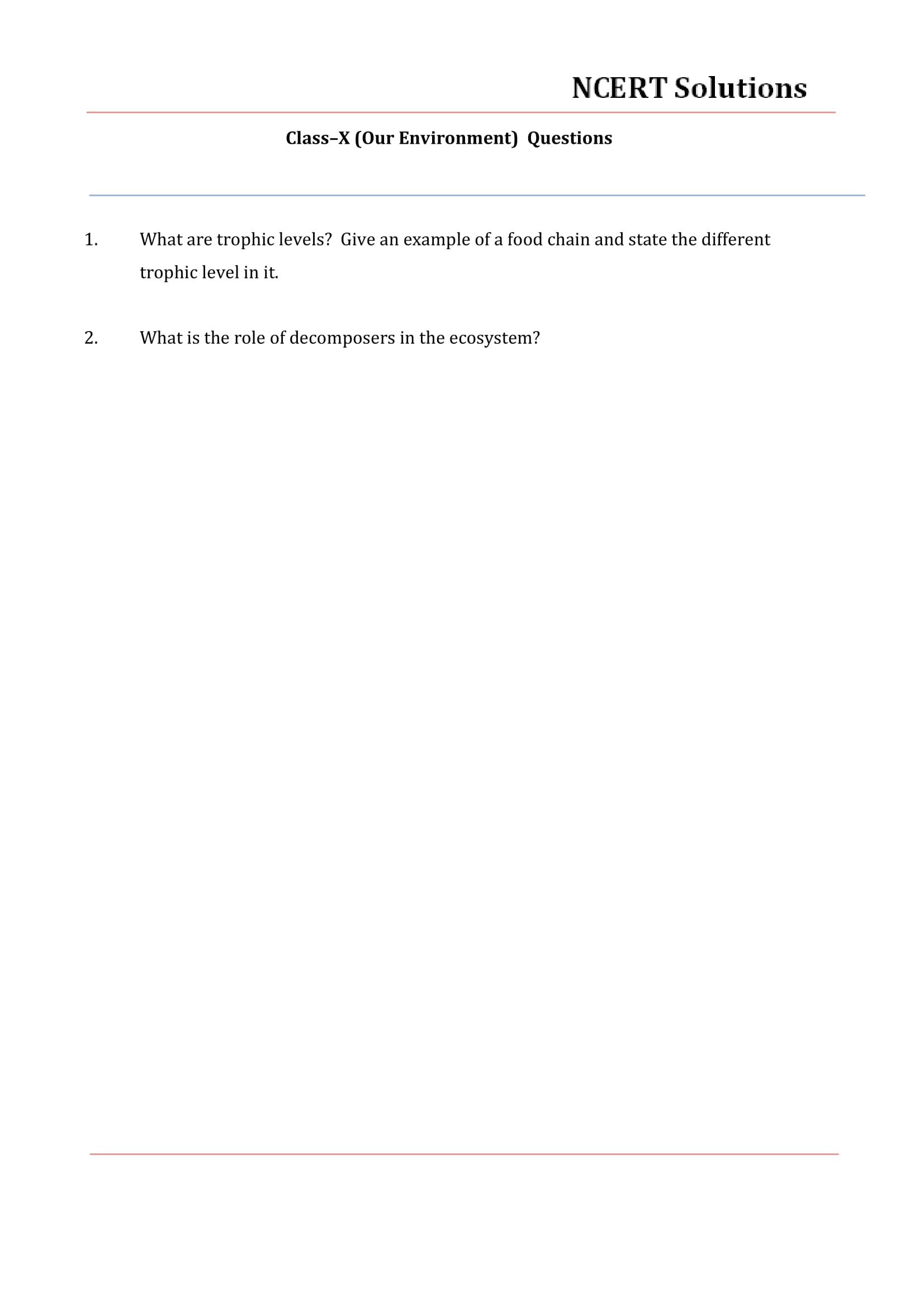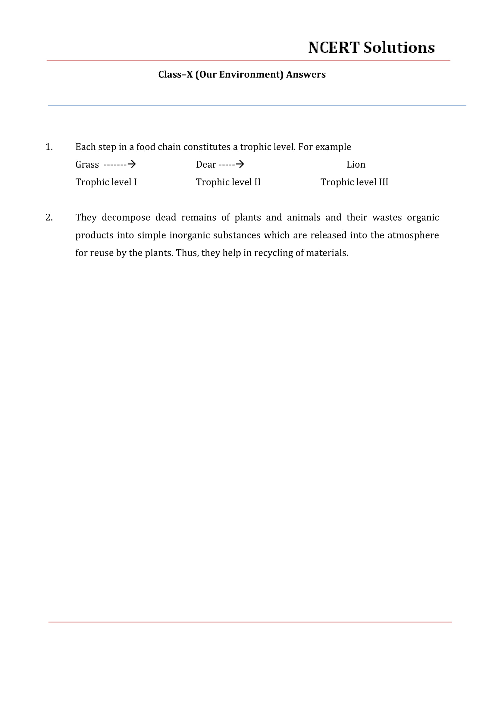 Class 10 Students take help from NCERT Solutions for Class 10 Science Chapter 15 Our Environment to study for their board examinations. In this chapter, you will learn the various components of an ecosystem are interdependent. The producers make the energy from sunlight available to the rest of the ecosystem. There is a loss of energy as we go from one trophic level to the next, this limits the number of trophic levels in a food-chain.