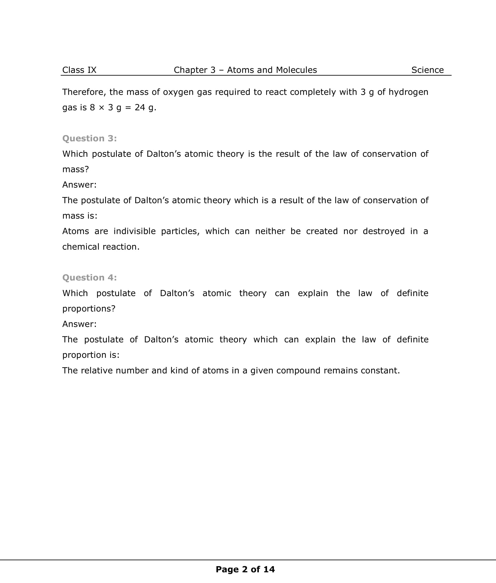 Students take help from NCERT Solutions for Class 9 Science Chapter 3 Atoms and Molecules to study for their examinations. In this Chapter, we will learn that during a chemical reaction, the sum of the masses of the reactants and products remains unchanged. This is known as the Law of Conservation of Mass. In a pure chemical compound, elements are always present in a definite proportion by mass. This is known as the Law of Definite Proportions.